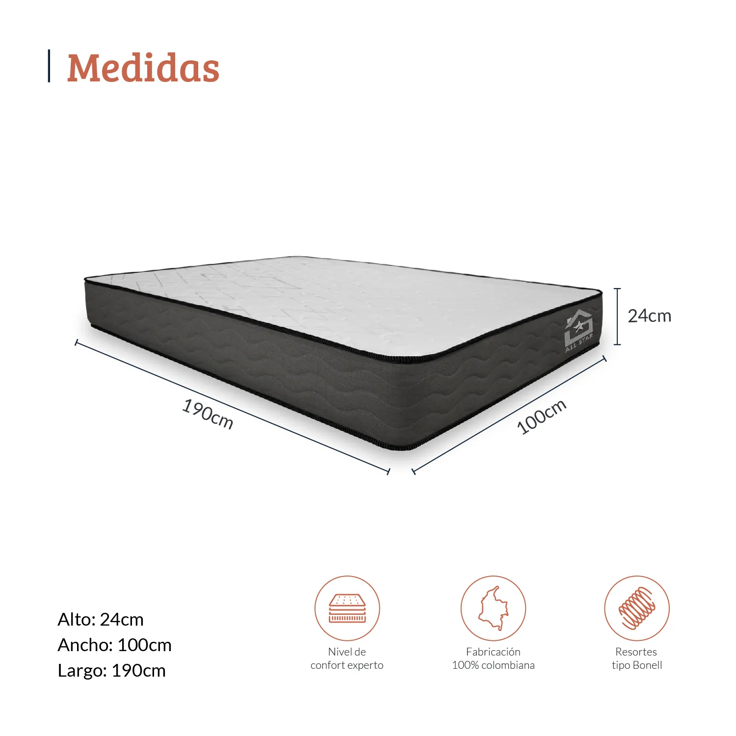 Con una altura aproximada de 24 cm y medidas variables de sencillo a doble, este colchón es la elección ideal para quienes buscan confort prolongado, soporte ergonómico y un diseño moderno para sus espacios.