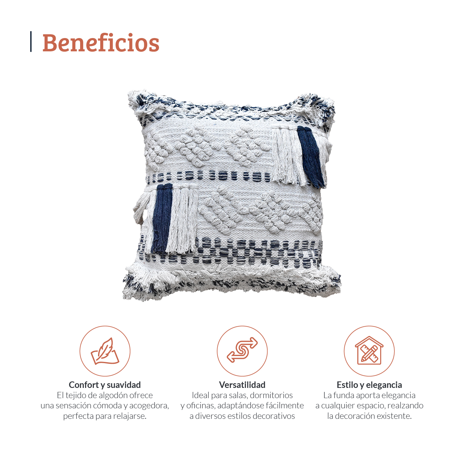 El Funda con Cojín Elite Antología – 45 × 45 cm es una pieza decorativa que combina textura, color y artesanía en un diseño pensado para transformar tus espacios. Elaborada en 100 % algodón, su base tejida incorpora formas geométricas, flecos y relieves que crean un efecto visual dinámico y elegante.