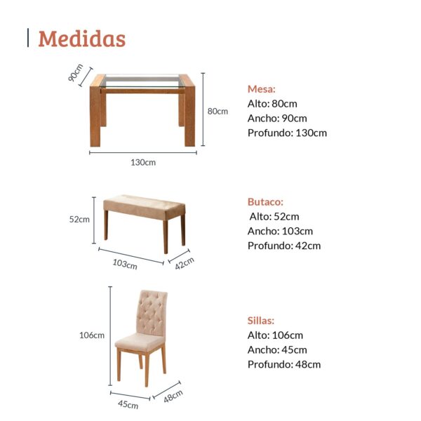 Mesa: Alto 80 cm, Ancho 90 cm, Largo 130 cm.