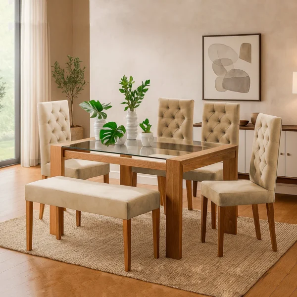 Gracias a su diseño versátil y sofisticado, este comedor se adapta a cualquier ambiente. Es ideal para familias que disfrutan compartir sus comidas, para oficinas que desean un espacio de reunión con estilo, o para hoteles que buscan ofrecer a sus huéspedes una experiencia única y elegante.