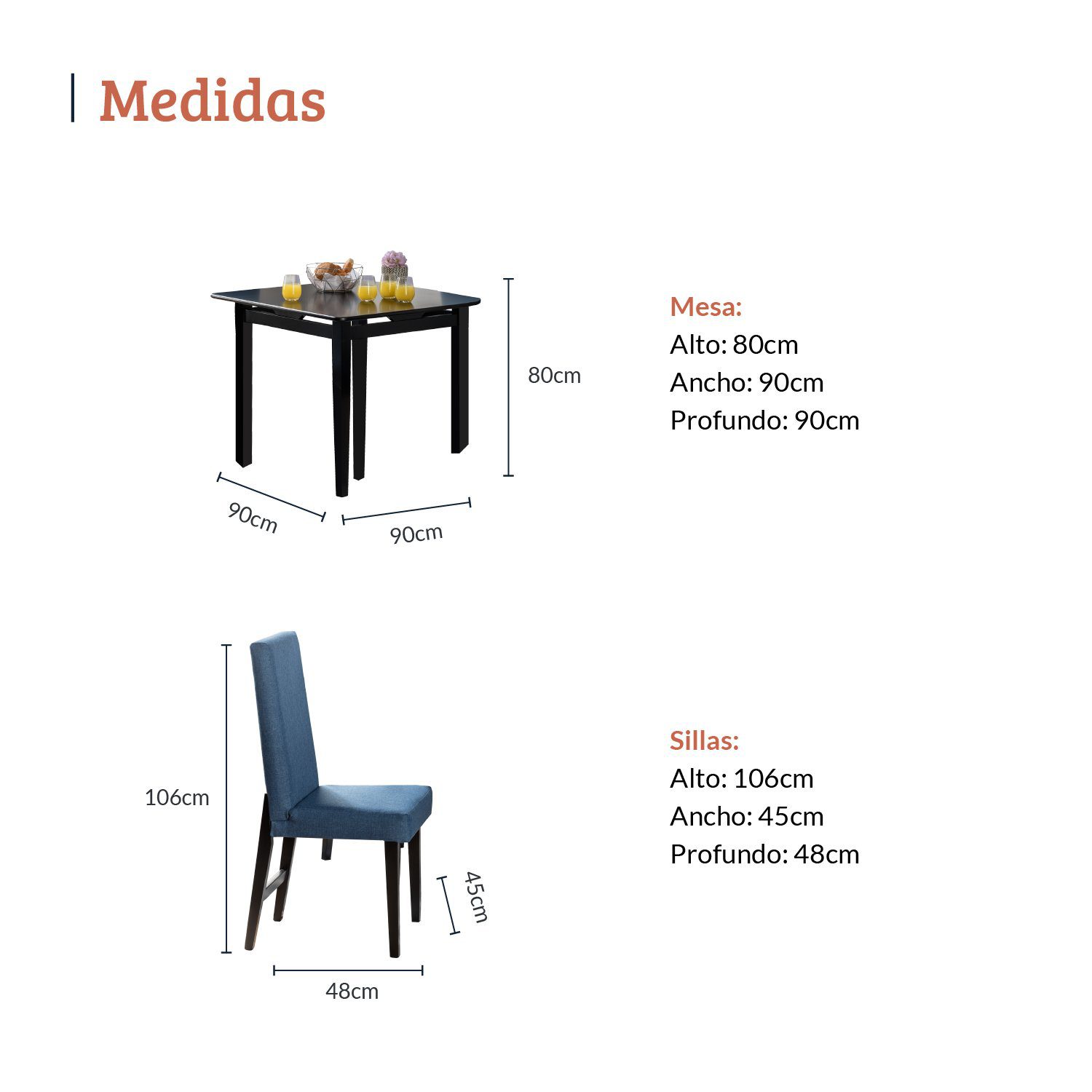 Mesa: Alto 80 cm, Ancho 90 cm, Largo 90 cm.