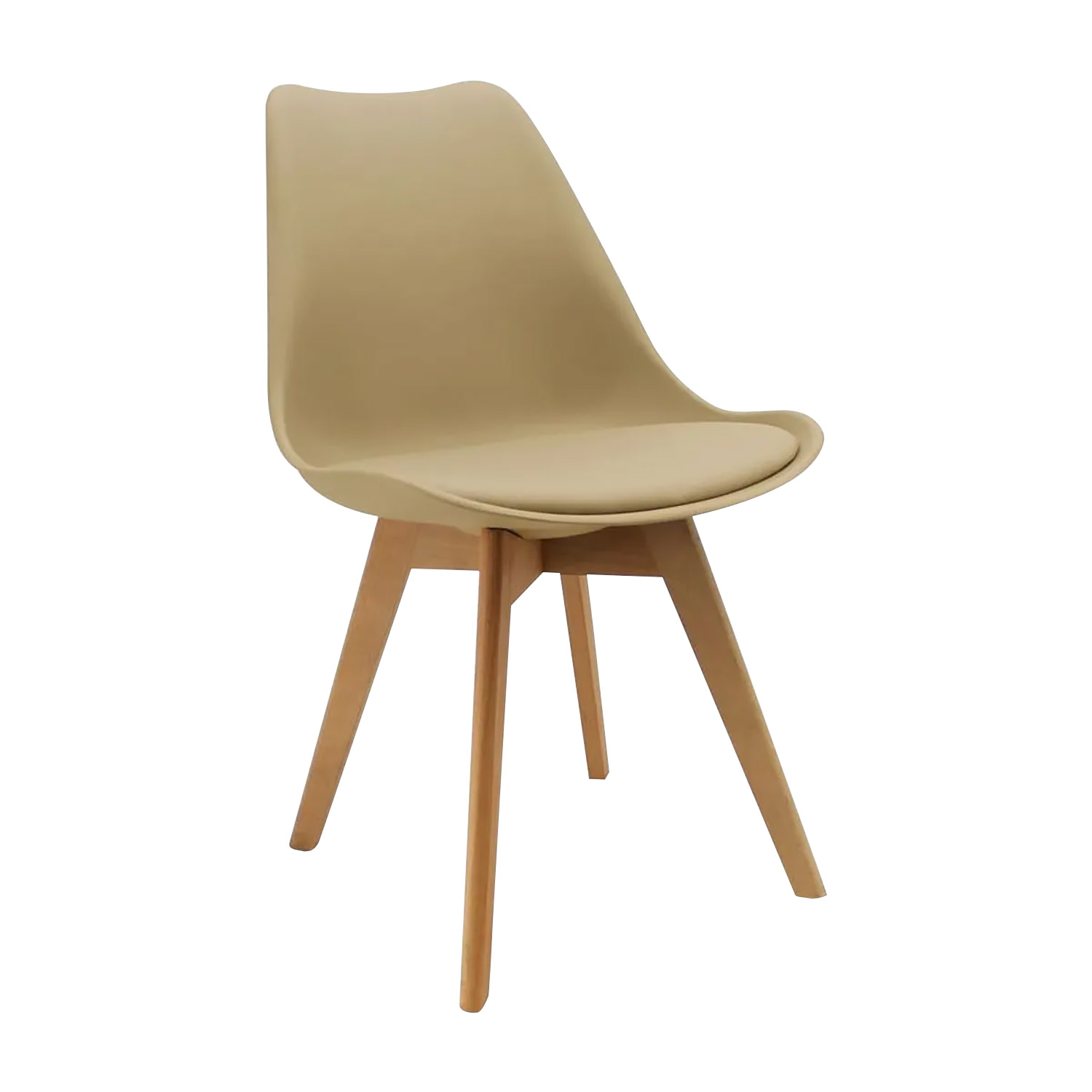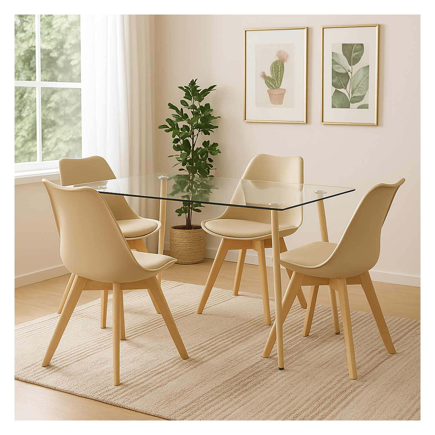 El set incluye cuatro sillas de comedor tapizadas diseñadas para ofrecer comodidad prolongada. Su respaldo de polipropileno inyectado aporta firmeza y ergonomía, mientras que el asiento, tapizado en ecocuero suave con espuma acolchada, brinda una experiencia de confort superior. Las patas de madera de arce completan la estructura con resistencia y un toque cálido que realza el diseño del conjunto.