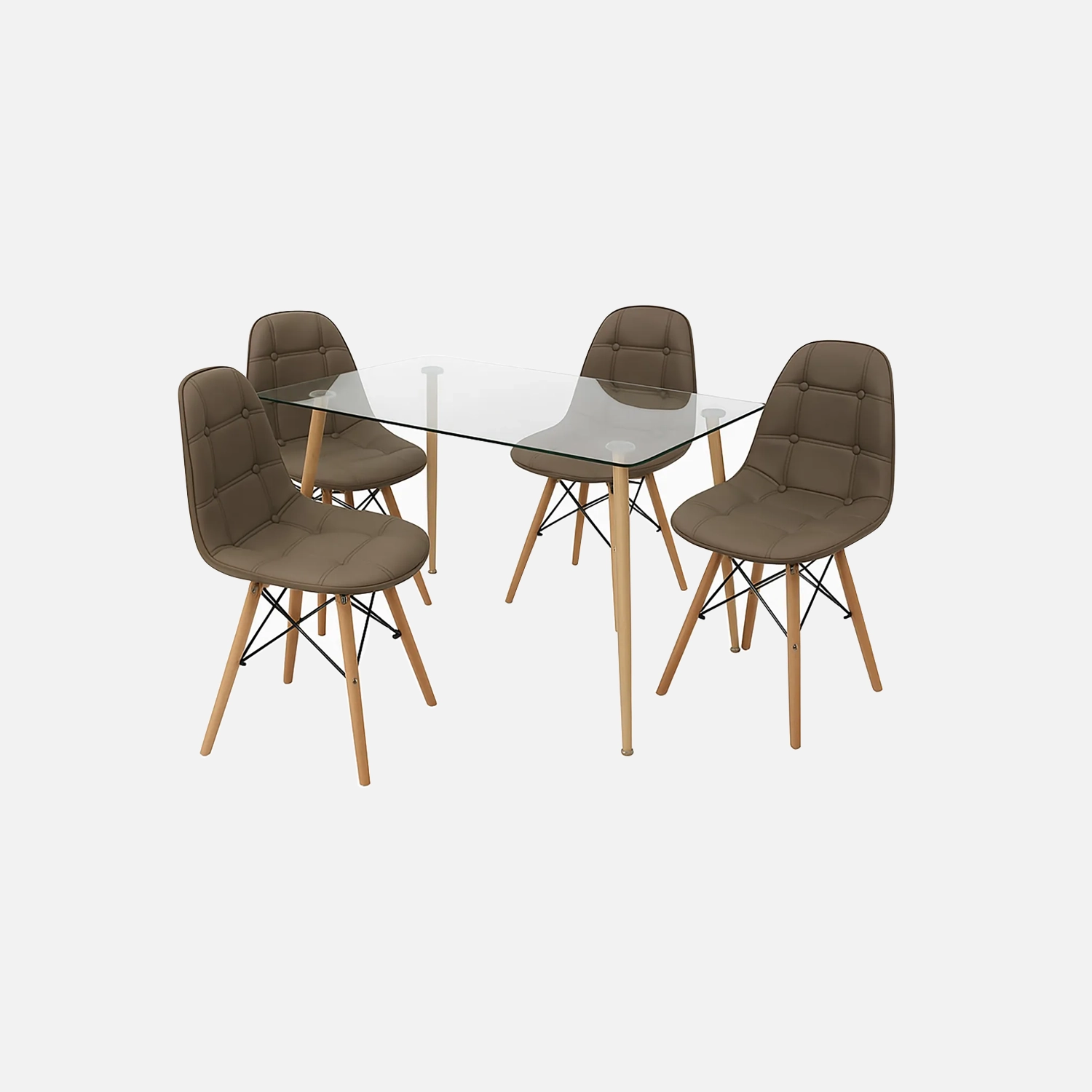 Juego de Comedor 4 puestos Rectangular Lynx con mesa de cristal templado y patas de acero efecto madera, acompañado de 4 sillas ergonómicas con patas de arce y asiento acolchado en ecocuero. Diseño moderno, estructura resistente y confort duradero, ideal para comedores funcionales y contemporáneos.