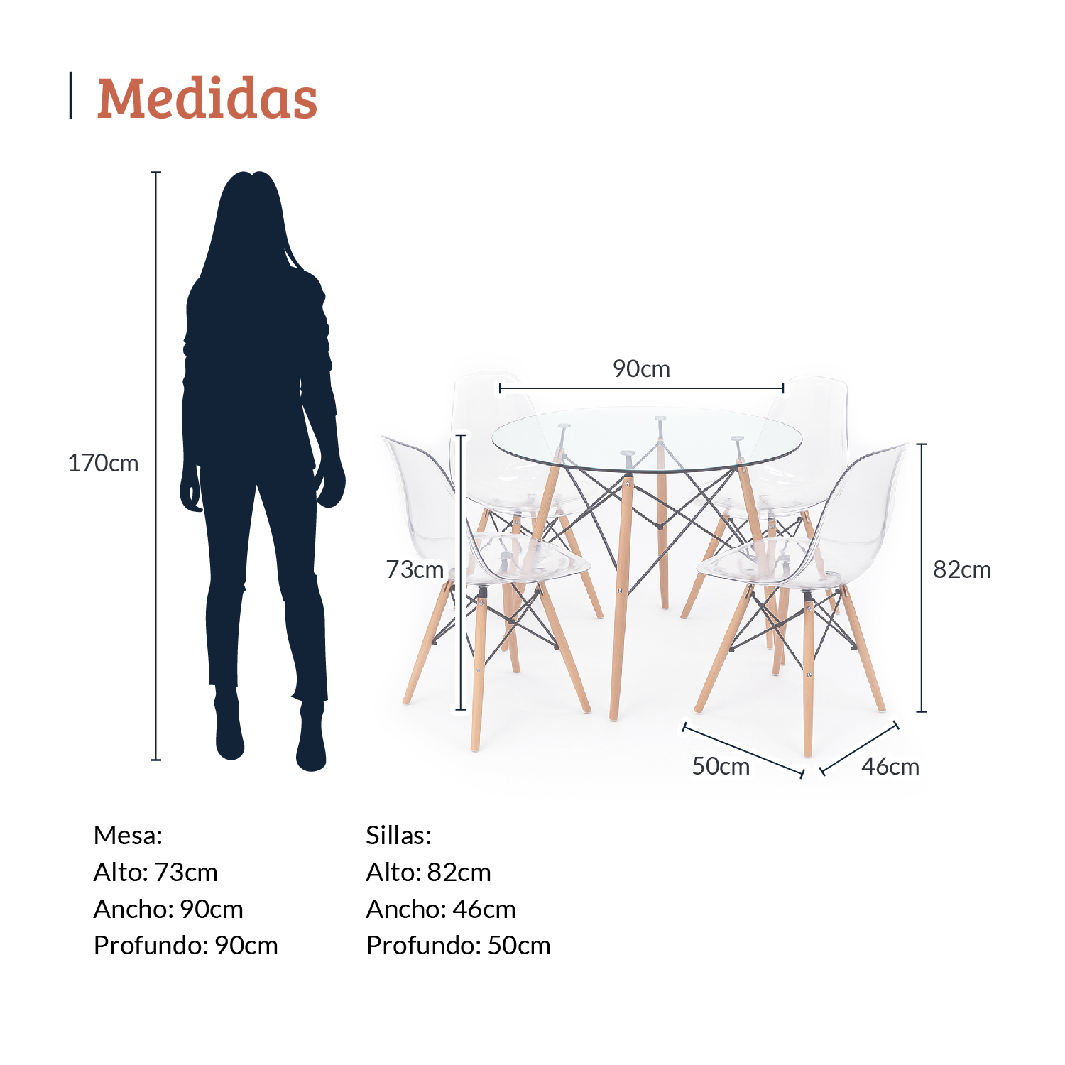 El set incluye cuatro sillas fabricadas en policarbonato inyectado de alta durabilidad, un material resistente que combina ligereza visual con firmeza estructural. Su respaldo ergonómico se adapta al cuerpo, ofreciendo comodidad en cada uso, ya sea en comidas familiares, reuniones con amigos o largas charlas alrededor de la mesa. La base metálica de las sillas garantiza soporte confiable y una larga vida útil, incluso con uso frecuente.