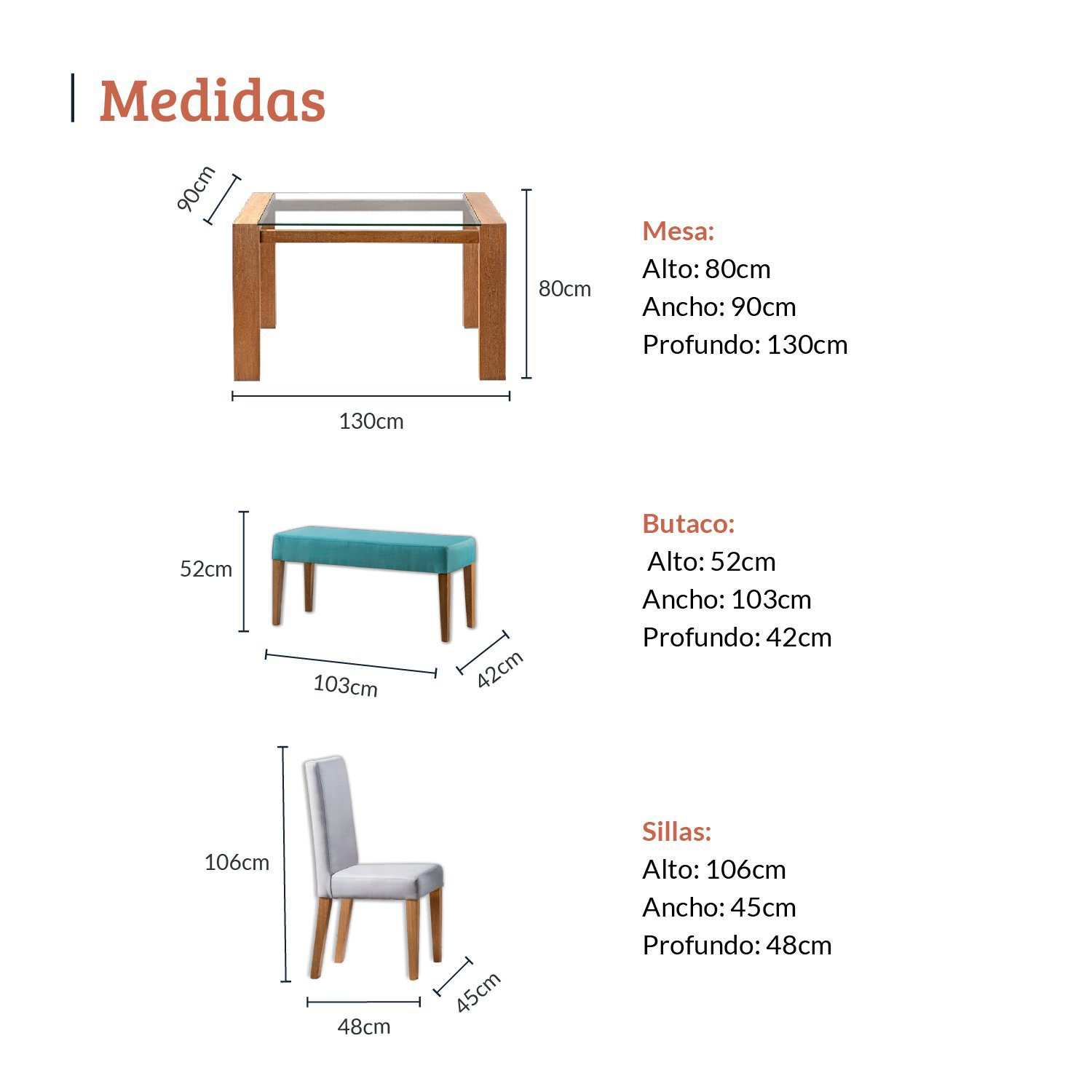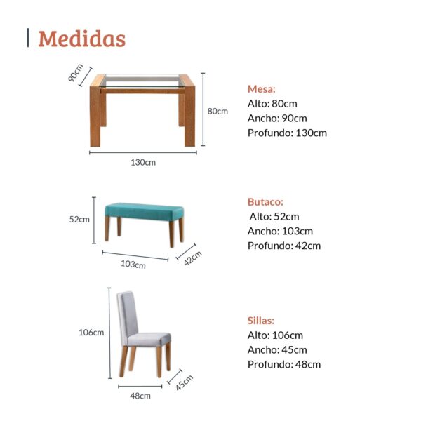 • Sillas: Alto 106 cm, Ancho 48 cm, Largo 45 cm.
