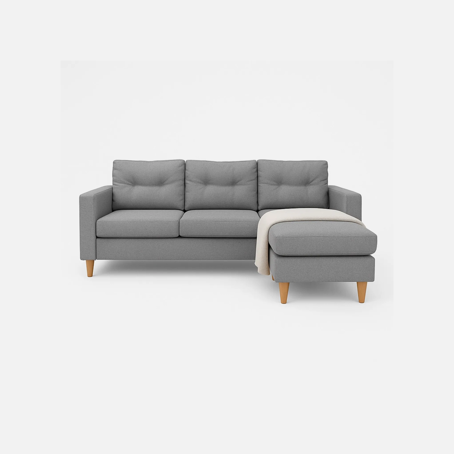 Sala en L modular Cielo: cambia el lado de la chaise o úsala como sofá y puff independientes. Tapizado premium, espaldar capitoneado y patas de madera. Hecha en Colombia.