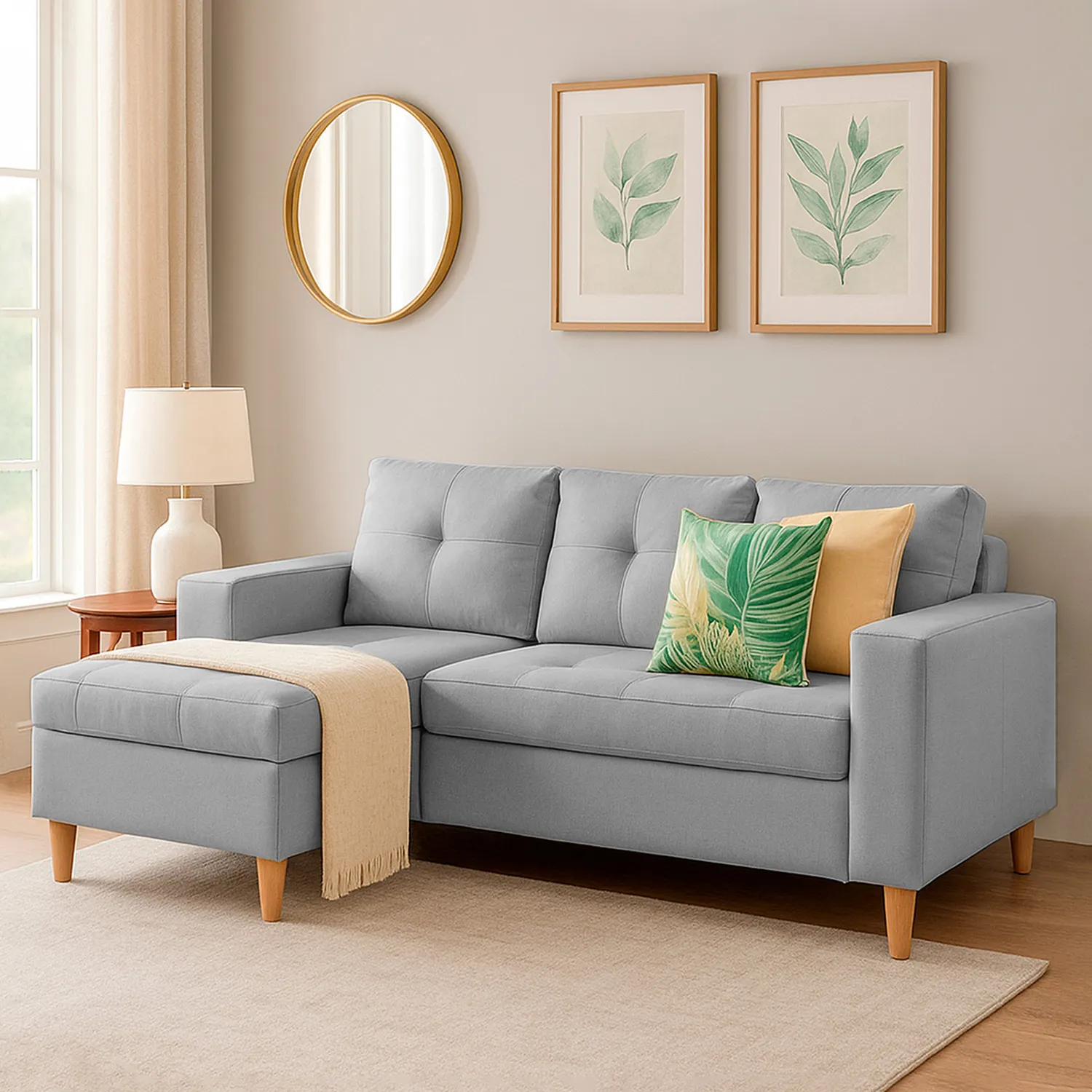 Materiales: Estructura resistente en madera de pino y tapizado en tela de alta calidad.