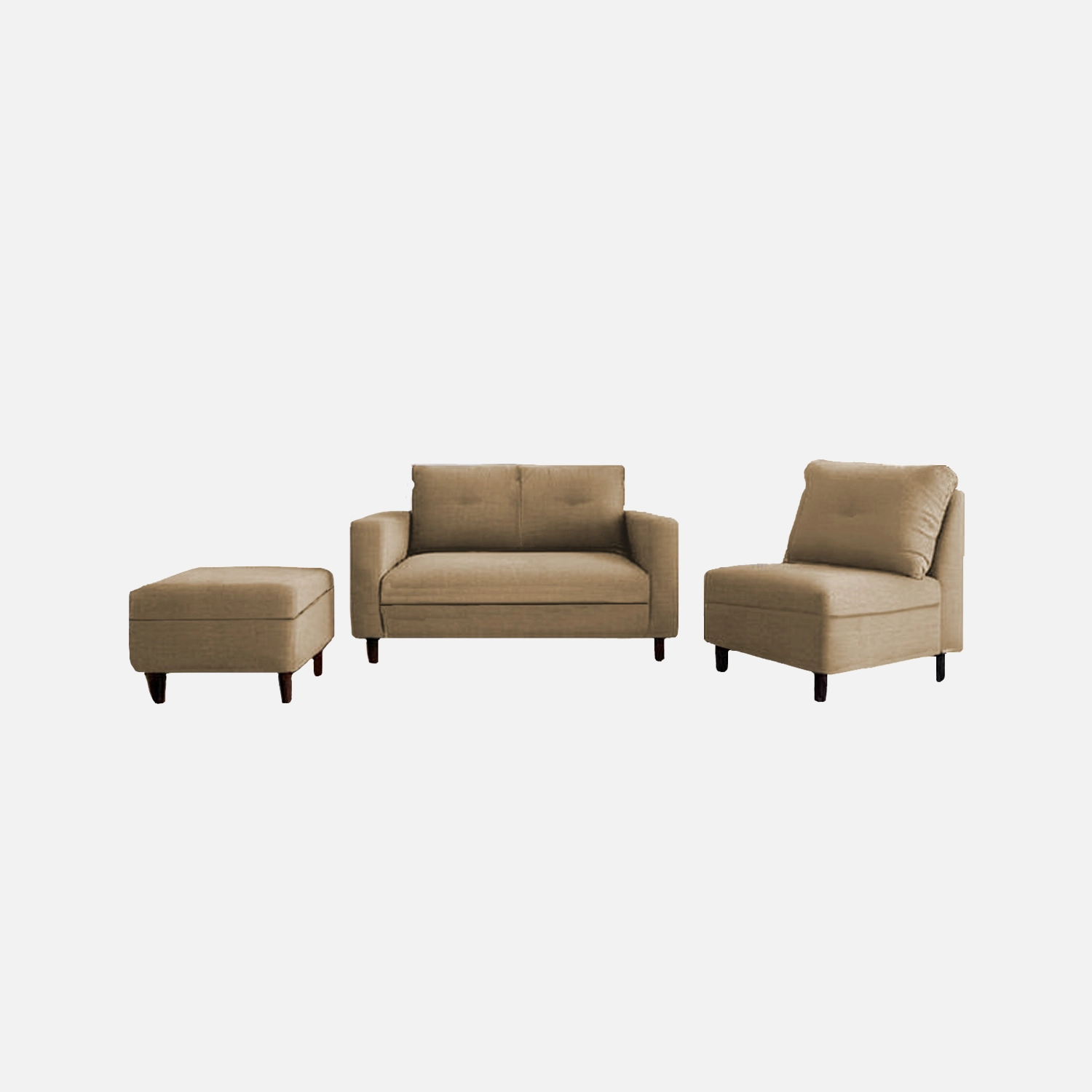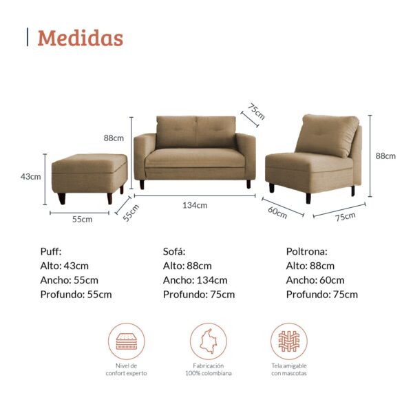 Incluye: Sofá de 2 puestos, poltrona moderna y puff decorativo.