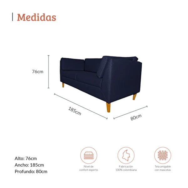 - Materiales: estructura en madera de pino y tapizado en tela de alta calidad.